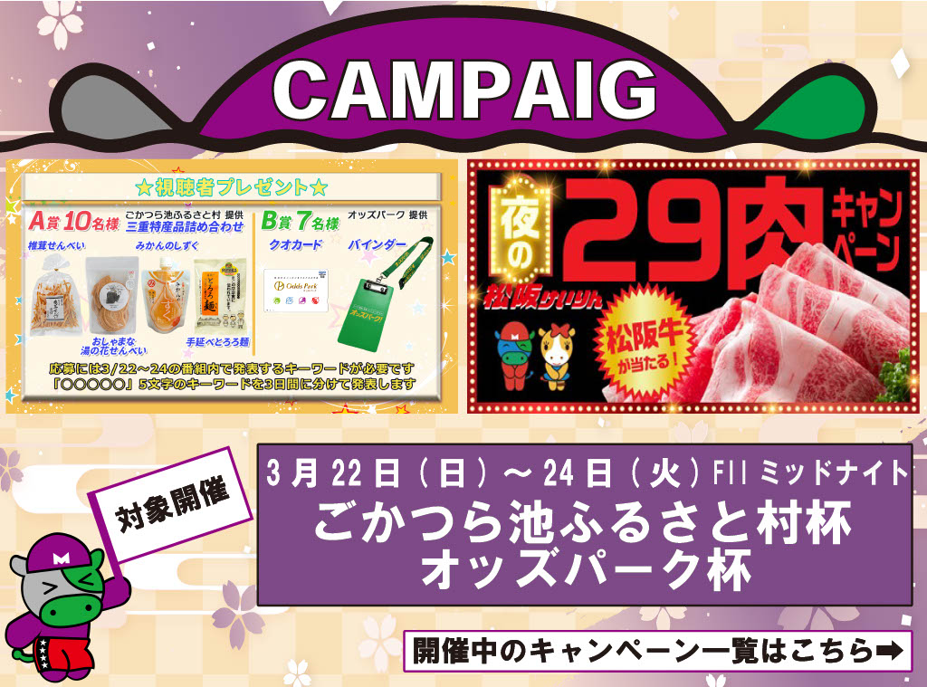 3月22日(日)~24日(火)松阪FIIミッドナイト 「ごかつら池ふるさと村杯 オッズパーク杯」開催のお知らせ