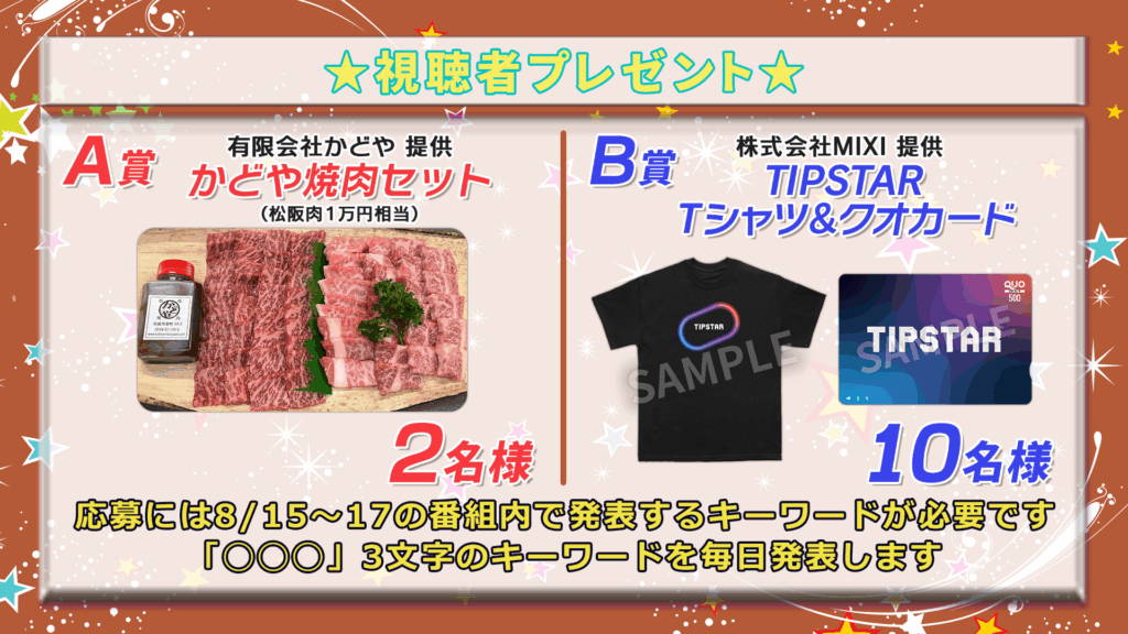 放送内で公開されるキーワードで「かどや焼肉セット」or「TIPSTAR Tシャツ&クオカード」が当たるチャンス!