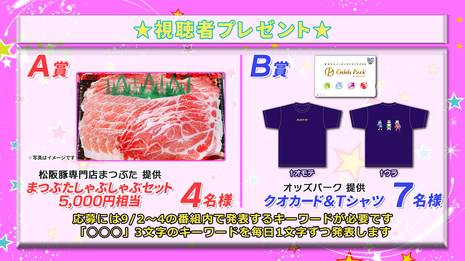 番組内で発表されるキーワードで松阪豚orクオカード&Tシャツが当たるチャンス!